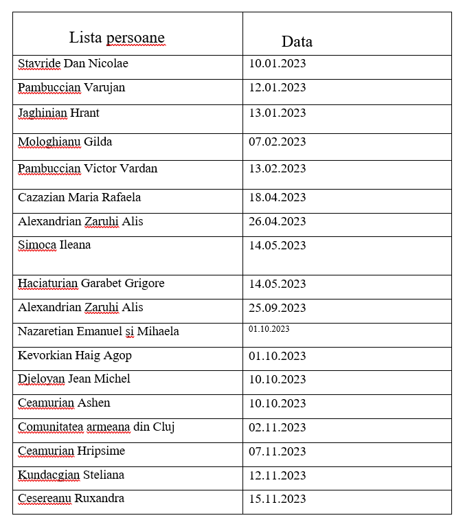 Fondul Armenia, reprezentanța din România s-a străduit să participe la acest efort enorm de ajutor umanitar și a colectat și trimis în 2023 la Fondul Armenia – centru, suma de 4200 euro si 50 de dolari USA. Lista donatorilor este anexată și profit de ocazie să mentionez în continuare: