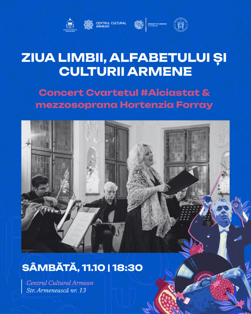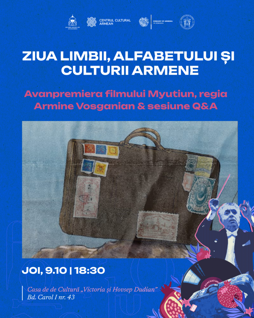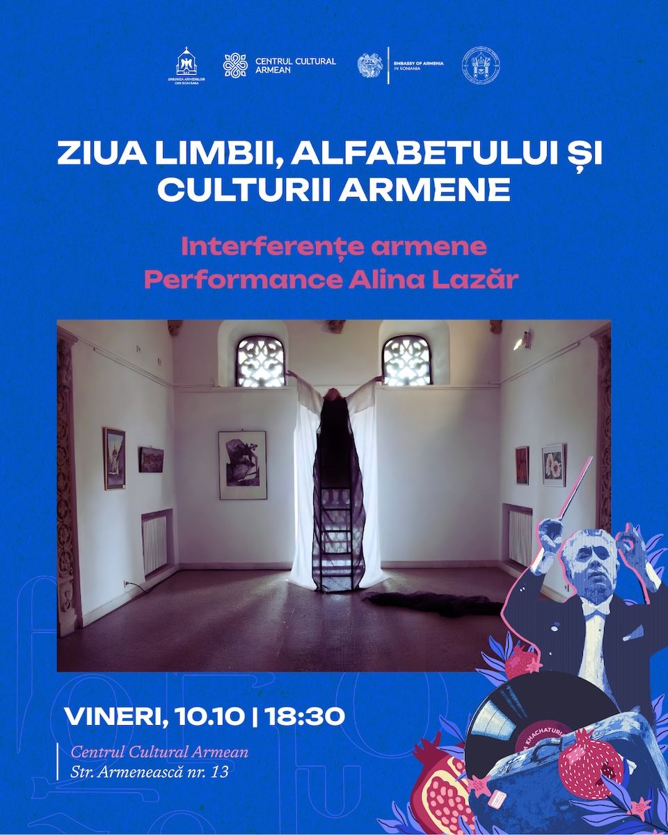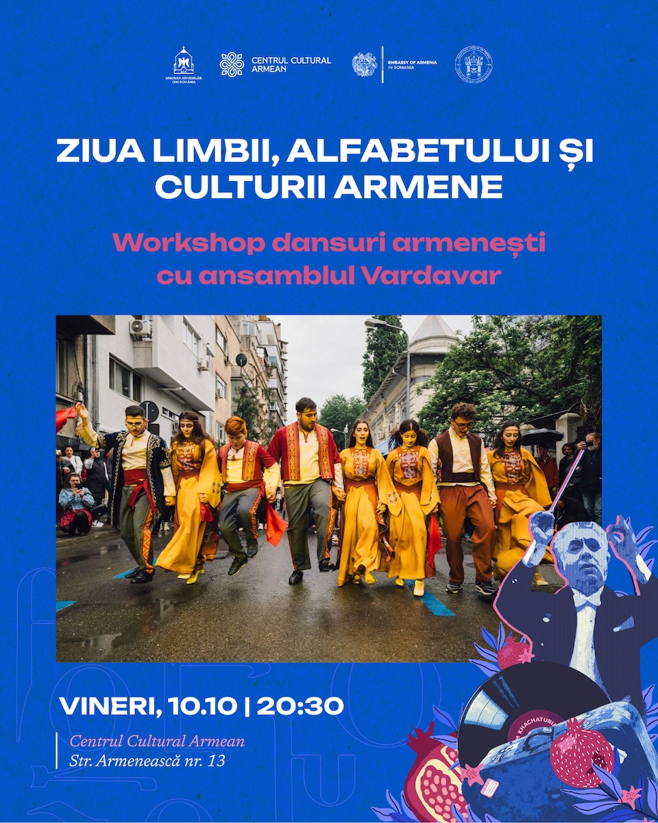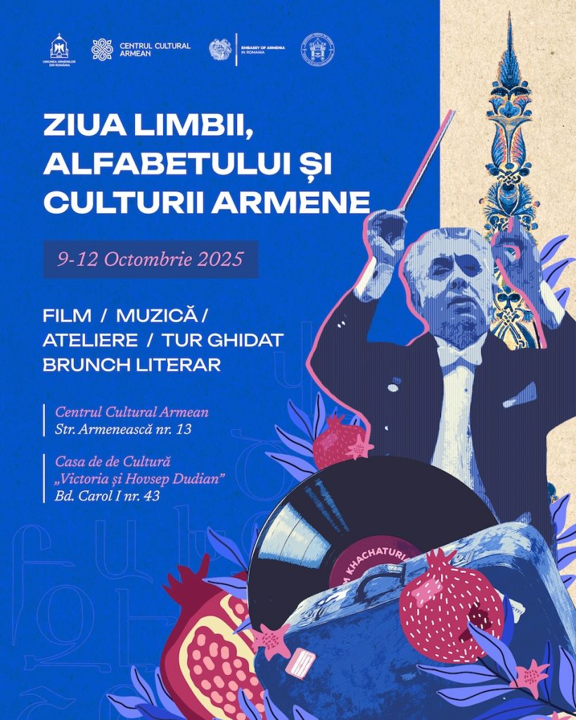 Uniunea Armenilor din România, prin Centrul Cultural Armean, organizează, între 9 și 12 octombrie 2025, o serie de evenimente care marchează Ziua Limbii, Alfabetului și Culturii Armene, printr-un program complex ce îmbină filmul, muzica, dansul, literatura, gastronomia și explorarea urbană.