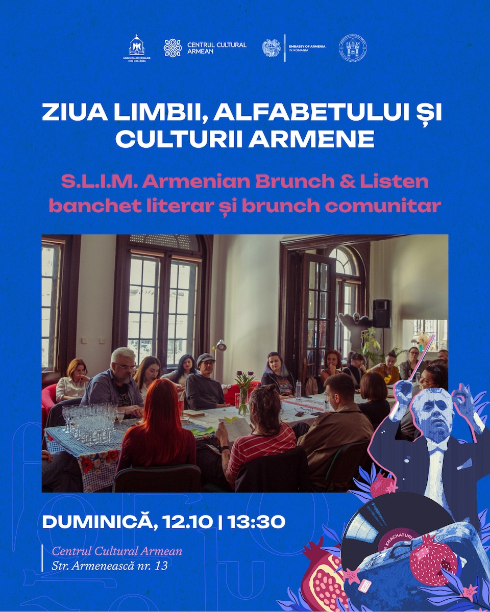 Ediția de toamnă a brunch-ului comunitar S.L.I.M. (Share, Listen, Interact, Mingle) capătă o nouă dimensiune culturală: o masă a poveștilor, cu cafea armenească și prăjitura marlenka. Participanții sunt invitați să aducă citate din autori armeni sau texte literare despre Armenia, pentru o sesiune de lecturi împărtășite și conversații despre literatură, memorie și apartenență.